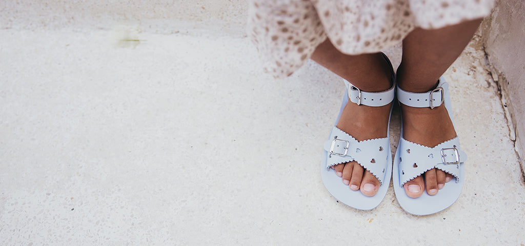 ハート型のカットとギザギザエッジが可愛らしい“スイートハート”。足首はベルクロストラップでフロントのストラップはベルトで調整できるので、どんな足幅にもフィットします。“サーファー”と同様でとても丈夫なのに、ガーリーなルックスになっています。